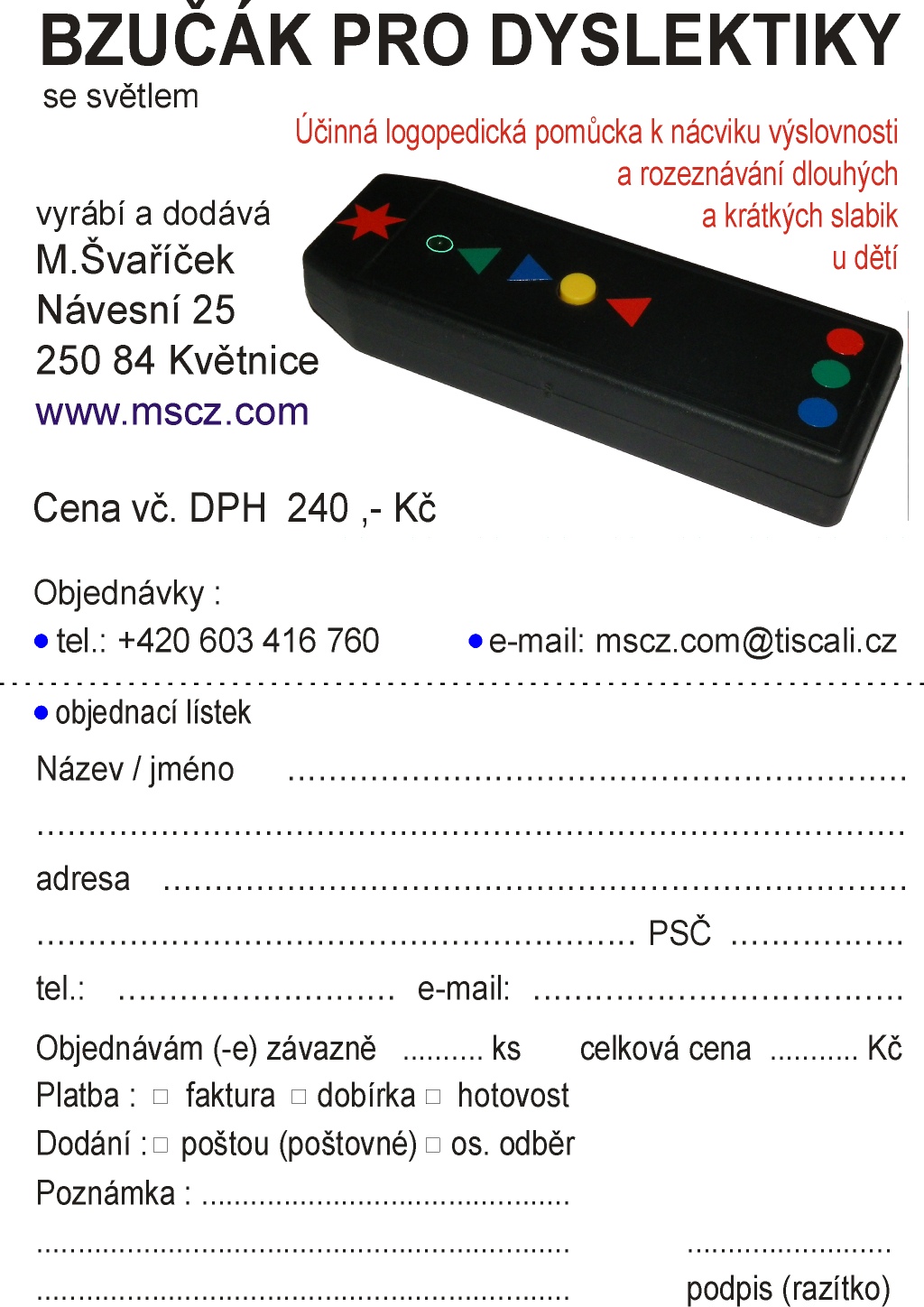 Bzučák pro dyslektiky se světlem - opětovné zahájení výroby osvědčené a účinné logopedické pomůcky pro děti, používané k nácviku výslovnosti a rozeznávání délky slabik, doporučované v minulosti i panem prof. PhDr. Zdeňkem Matějčkem, Csc..